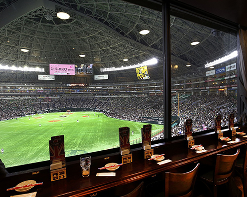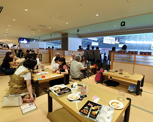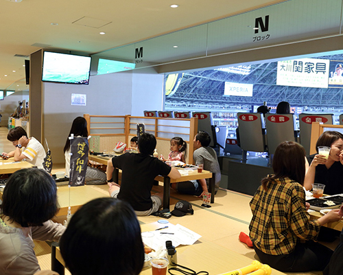 ヤフオクドーム6階に位置し、球場内を見渡せる畳席の「なごみシート」。多彩なビュッフェと飲み放題で二次会はいかがでしょうか?